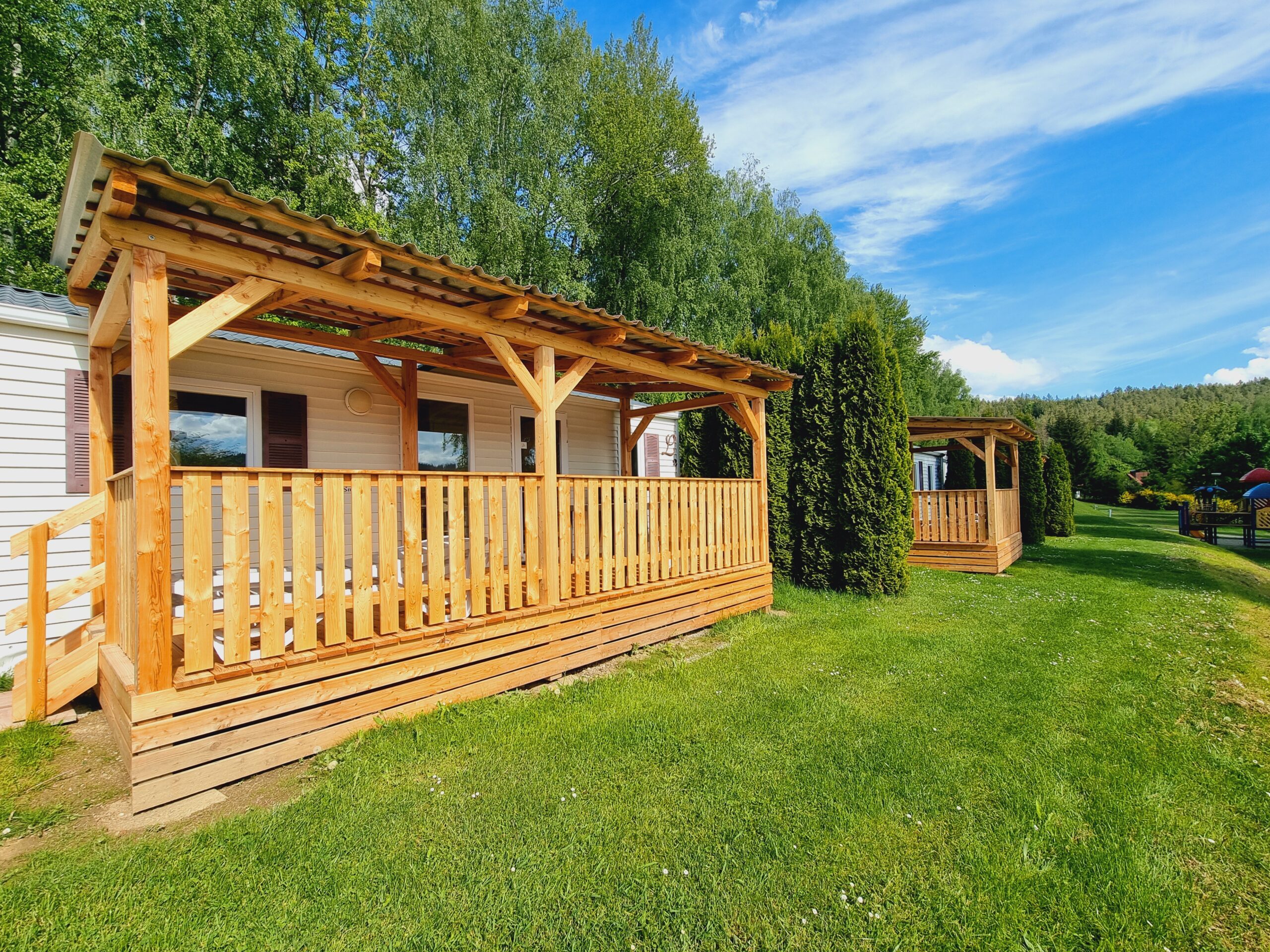 Komfortní mobilní domky s krytou venkovní terasou. Kapacita až 6 osob, 2-3 ložnice.